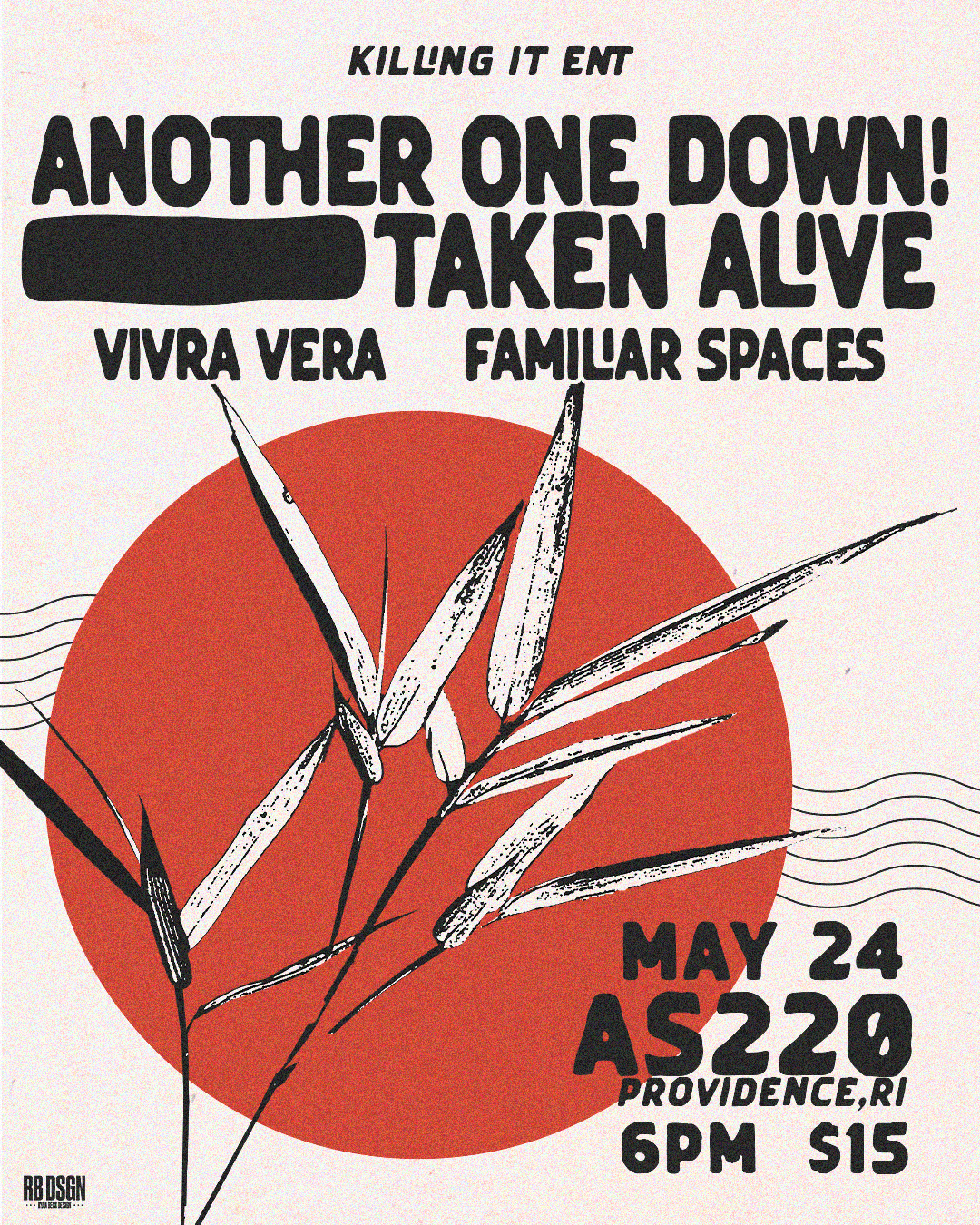Another One Down! + Taken Alive + Vivra Vera + Familiar Spaces Sunday, May 24, 2026 6:00 PM 11:30 PM AS220 Main Stage 115 Empire Street Providence, RI, 02903 United States (map) Google Calendar ICS Get tickets