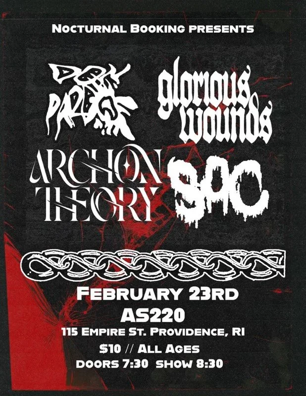 Archon Theory, Glorious Wounds, SAC, and Don Pardo Friday, February 23, 2024 8:00 PM 11:55 PM AS220 Main Stage 115 Empire Street Providence, RI, 02903 United States (map) Google Calendar ICS