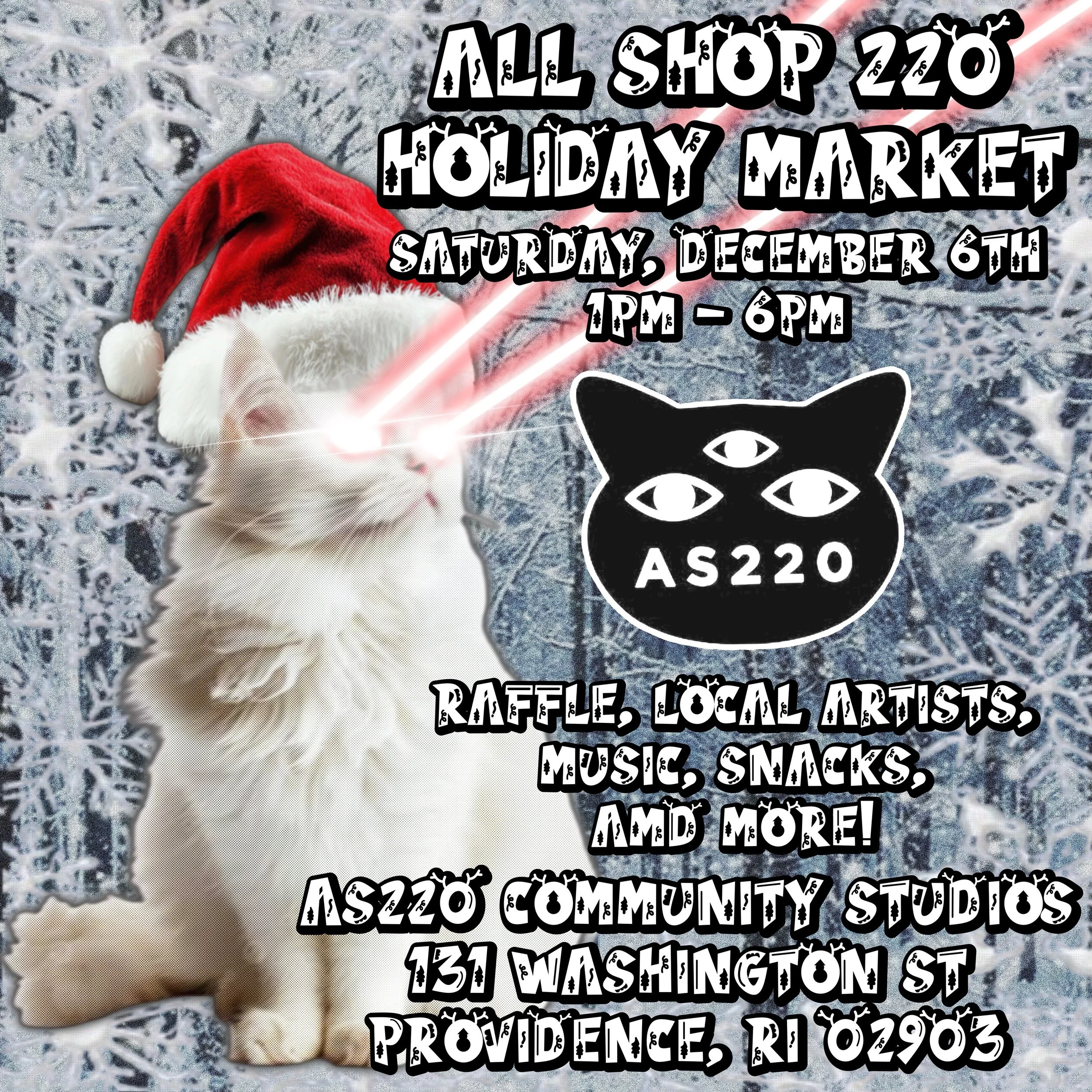 AS220 Holiday Market Saturday, December 6, 2025 1:00 PM 6:00 PM AS220 Community Studios Lucie Way Providence, RI, 02903 United States (map) Google Calendar ICS Join us on Saturday, December 6th, from 1-6pm at the AS220 Community Studios for our ~ holiday season ~ event with vendors, snacks, DJs, raffle, photo booth, and more! Event is FREE to attend.