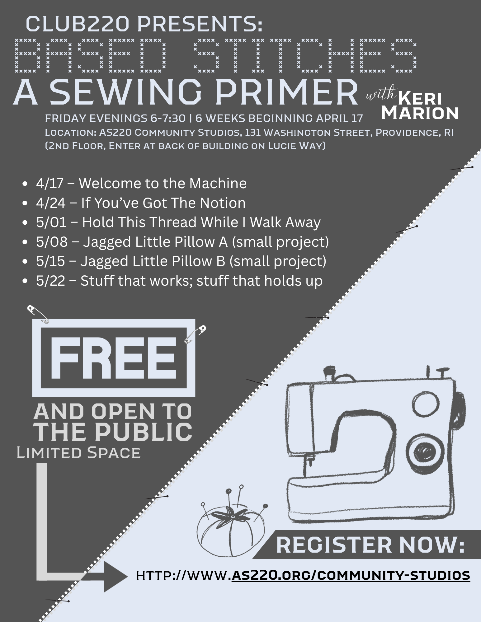 A sewing group to teach you how to use and care for a sewing machine, exploration of tools, sewing feet, materials, needle sizes & weights, matching fabric to needles, the importance of hand sewing, finishing stitches. online and in-person sewing resources. This club is for mostly very-beginners or early sewists of any gender, make or model. Participants can bring their own portable sewing machine if they don't want to use the ones on hand.