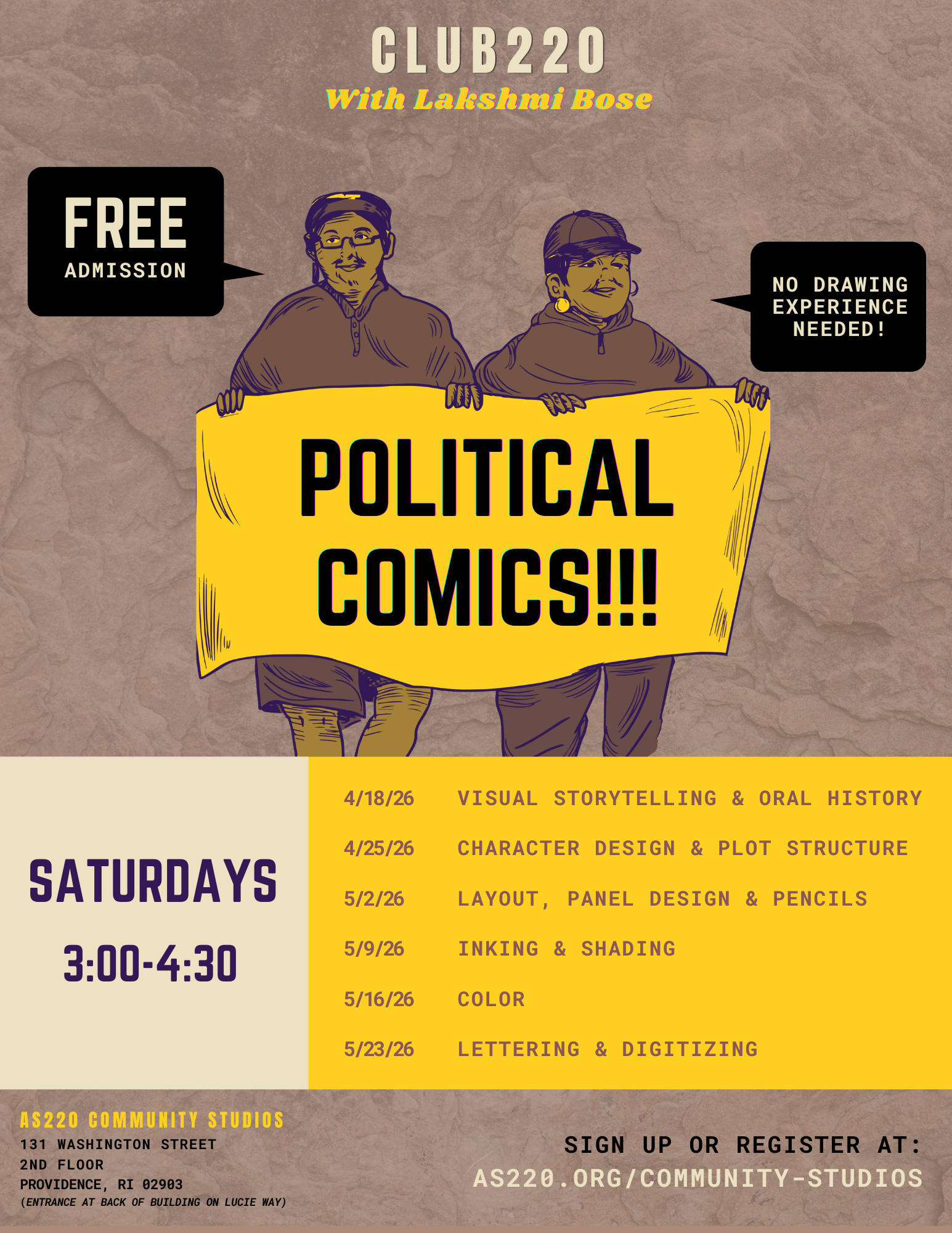 Learn how to create political or non-fiction comics from start to finish. They will use oral history, research and personal memory as a basis to narrate and share compelling real-life stories. Participants will also learn comic techniques including character design, panelling, inking, colour theory and lettering. Traditional methods (pencil and ink) will be used, students will have the opportunity to digitize their work at the end. No drawing experience necessary!